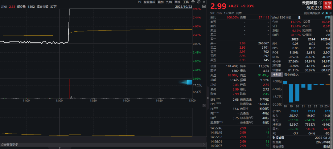 22日13时08分28秒,一笔104万手的买单突然涌入云南城投(600239),24秒后,该股股价于13时08分52秒冲上涨停。截至收盘,云南城投股价报2.99元/股,成交额超5亿元。